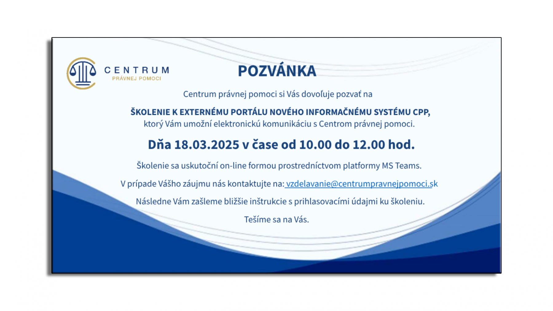 Centrum právnej pomoci si Vás dovoľuje pozvať na online školenie k externému portálu nového informačného systému CPP, ktoré Vám umožní elektronickú komunikáciu s naším Centrom.