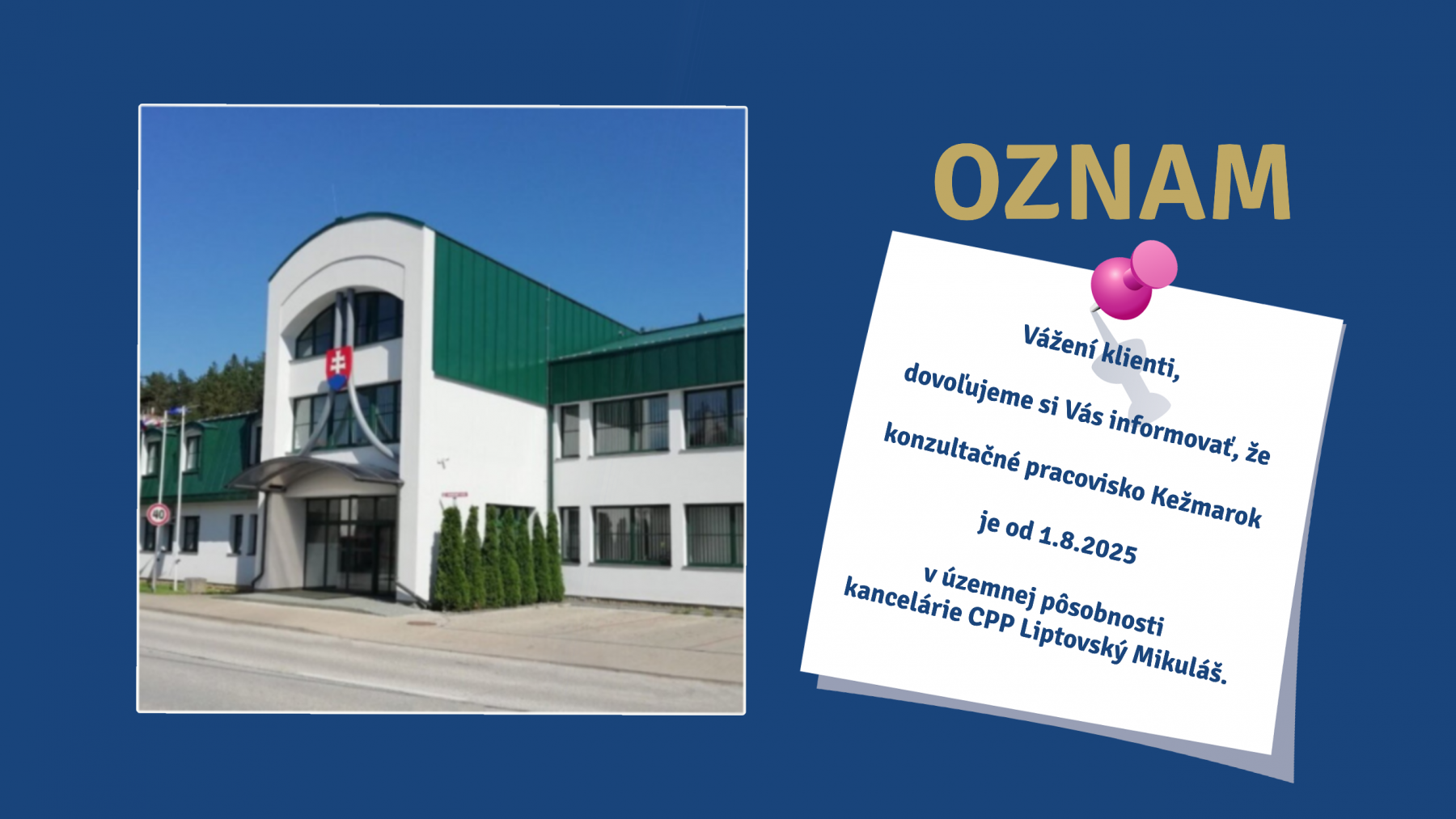 K zmene klientskych dní a úradných hodín nedochádza a naši kolegovia z Liptovského Mikuláša sa Vám budú naďalej venovať v utorky - dvakrát do mesiaca, v úradných hodinách.